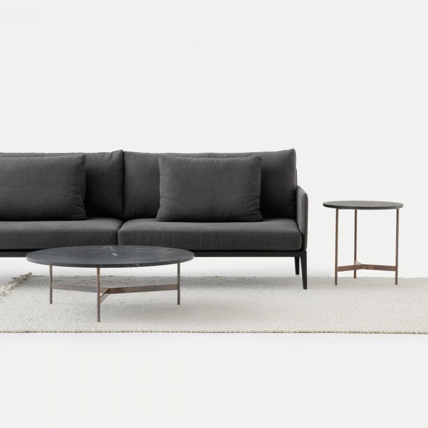 The Border Side Table offers a refined three leg base in a range of different finishes including black or white powder-coat steel and aged brass. The round top comes in natural oak, black stained oak, Carrara marble, Tundra marble and black Marquina marble.