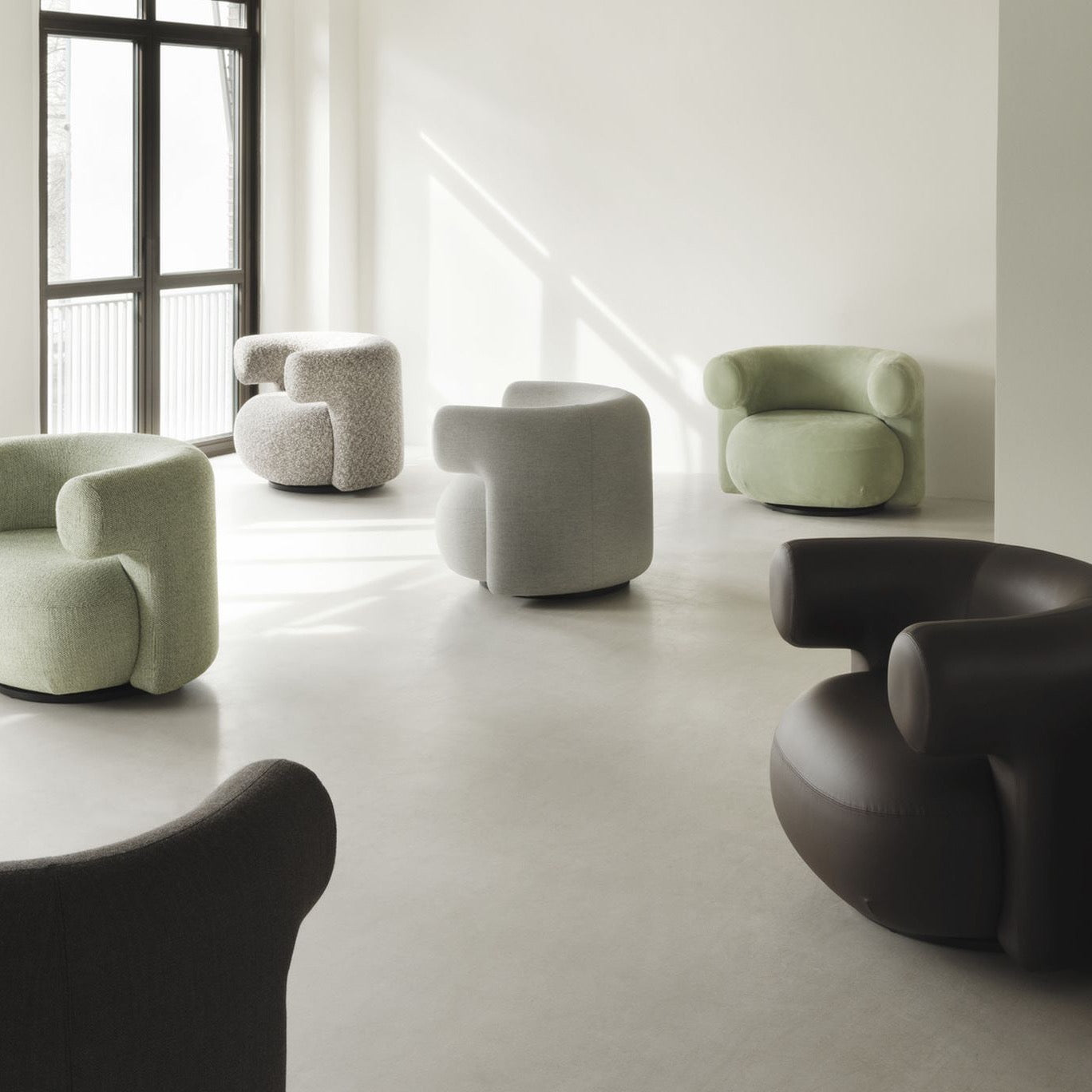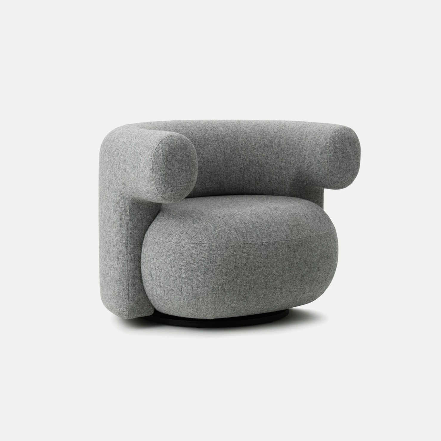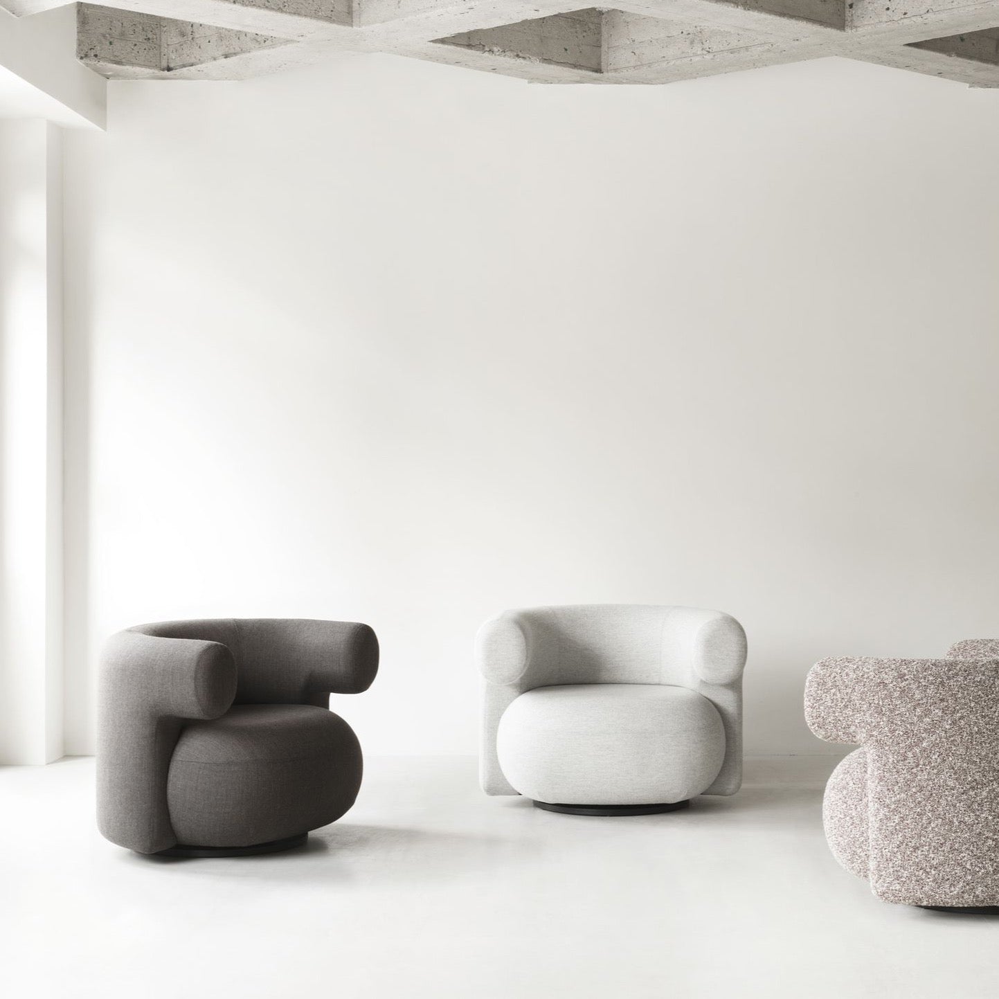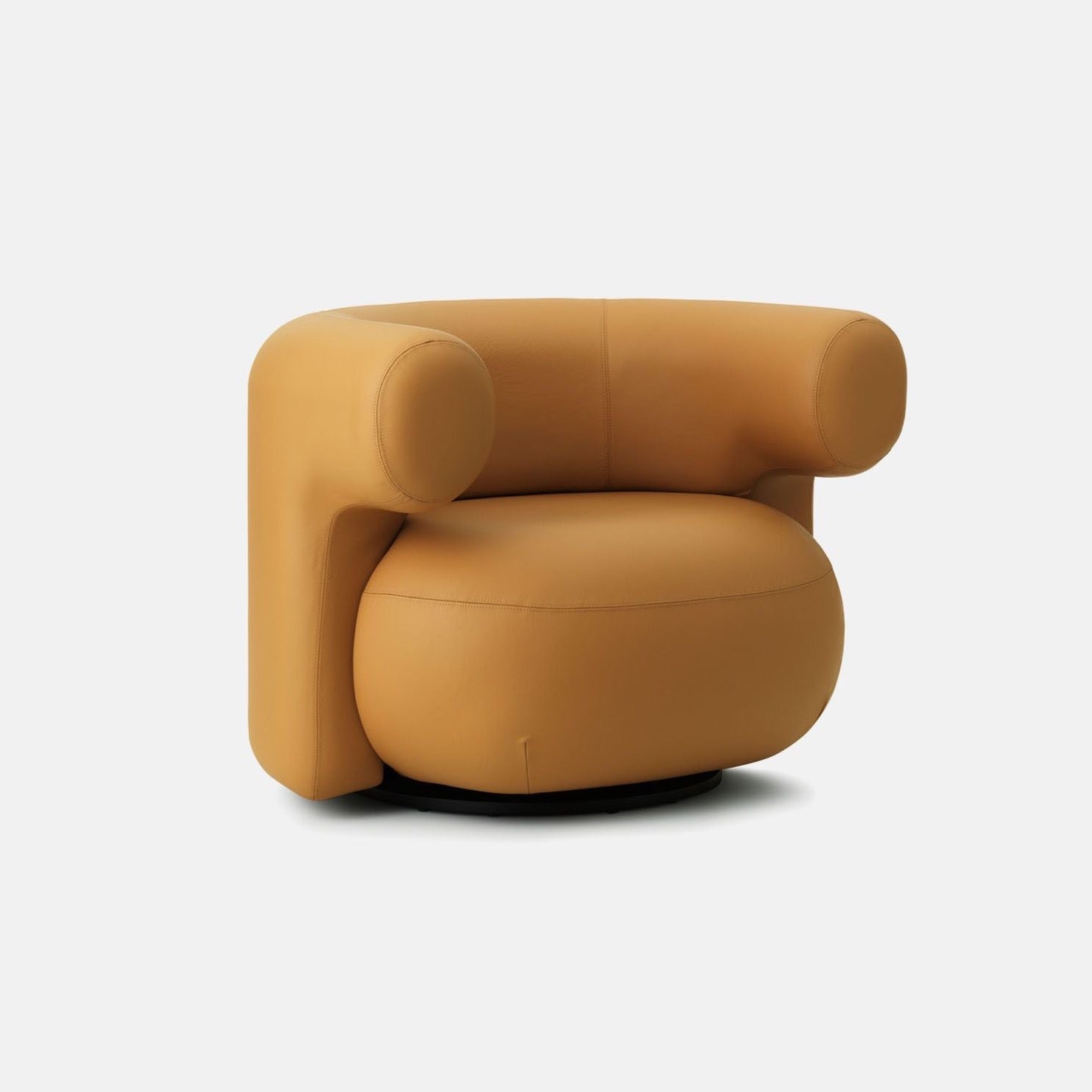 Burra is a sculptural lounge chair with a characteristic soft expression. The rounded seat is fitted with a swivel function with the possibility of an optional return swivel function for additional mobility. Burra is crafted for maximum comfort. Inside, a steel reinforcement structure provides stability and strength, while a combination of elastic bands, hard moulded foam and soft moulded foam ensures soft seating comfort.