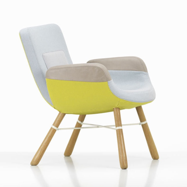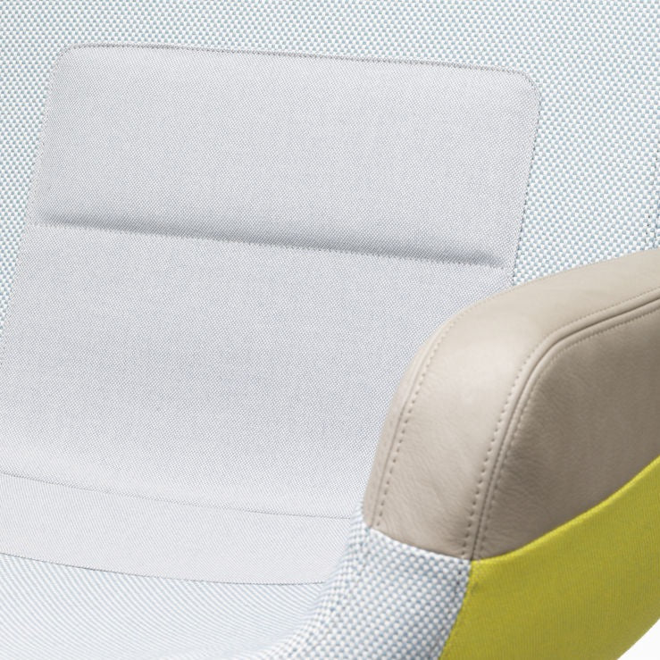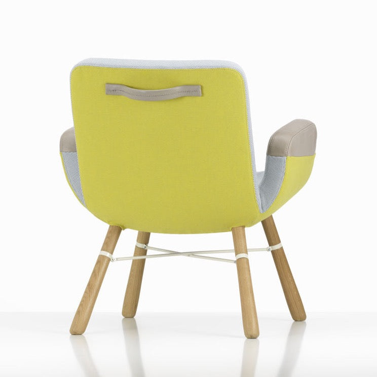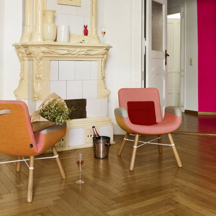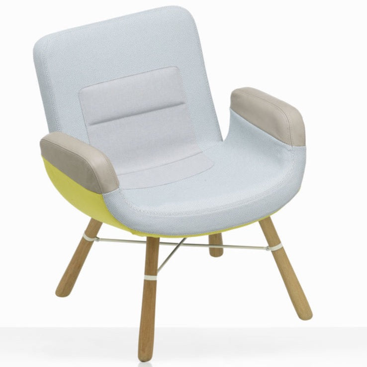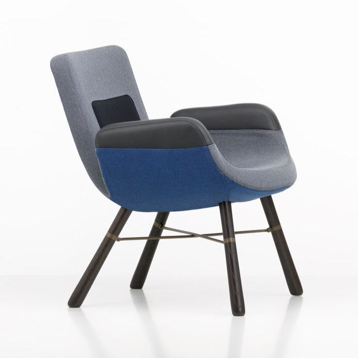 The East River Chair by Hella Jongerius is a striking, small armchair composed of diverse materials such as wood, metal, leather and fabric. The carefully selected combination of colours and materials does not have a purely aesthetic purpose: the practical leather covers protect the armrests from dirt and wear, and the thicker padding of the seat custion provides optimum lumbar support.