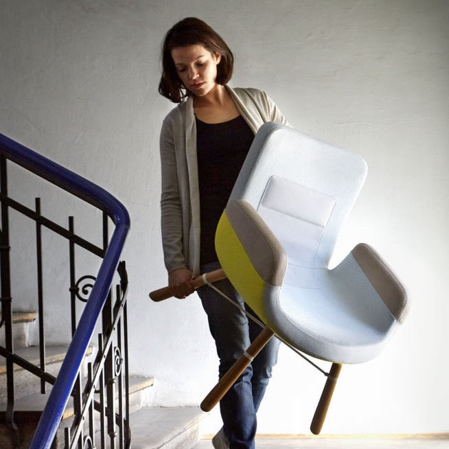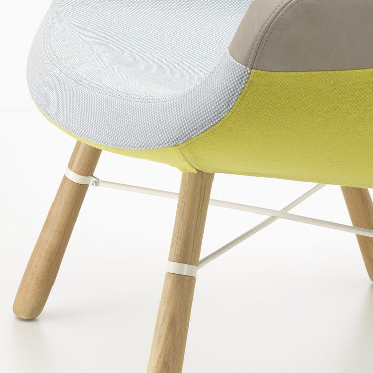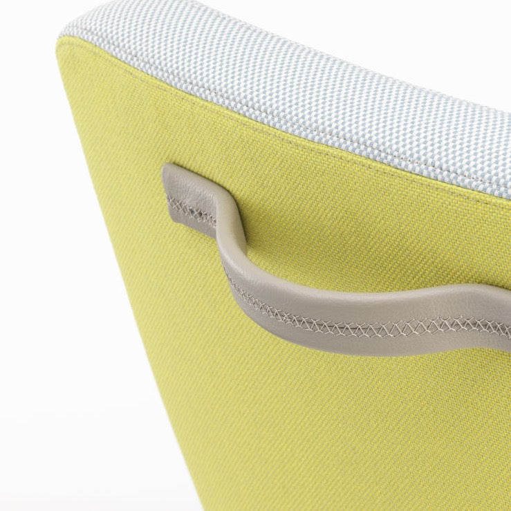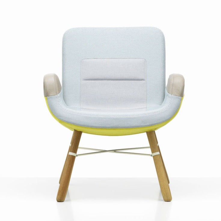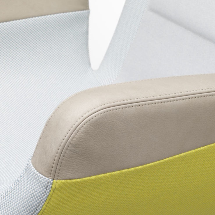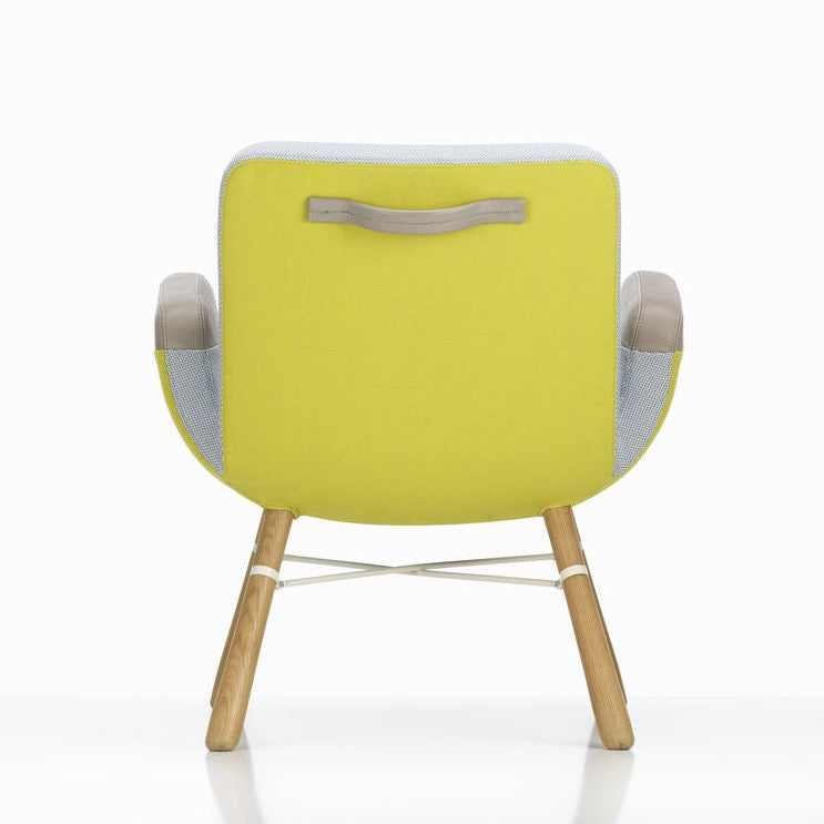The East River Chair by Hella Jongerius is a striking, small armchair composed of diverse materials such as wood, metal, leather and fabric. The carefully selected combination of colours and materials does not have a purely aesthetic purpose: the practical leather covers protect the armrests from dirt and wear, and the thicker padding of the seat custion provides optimum lumbar support.