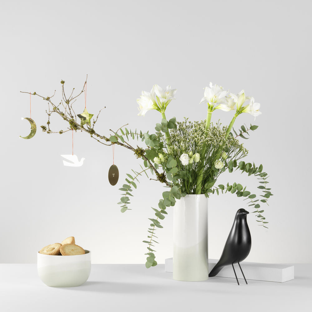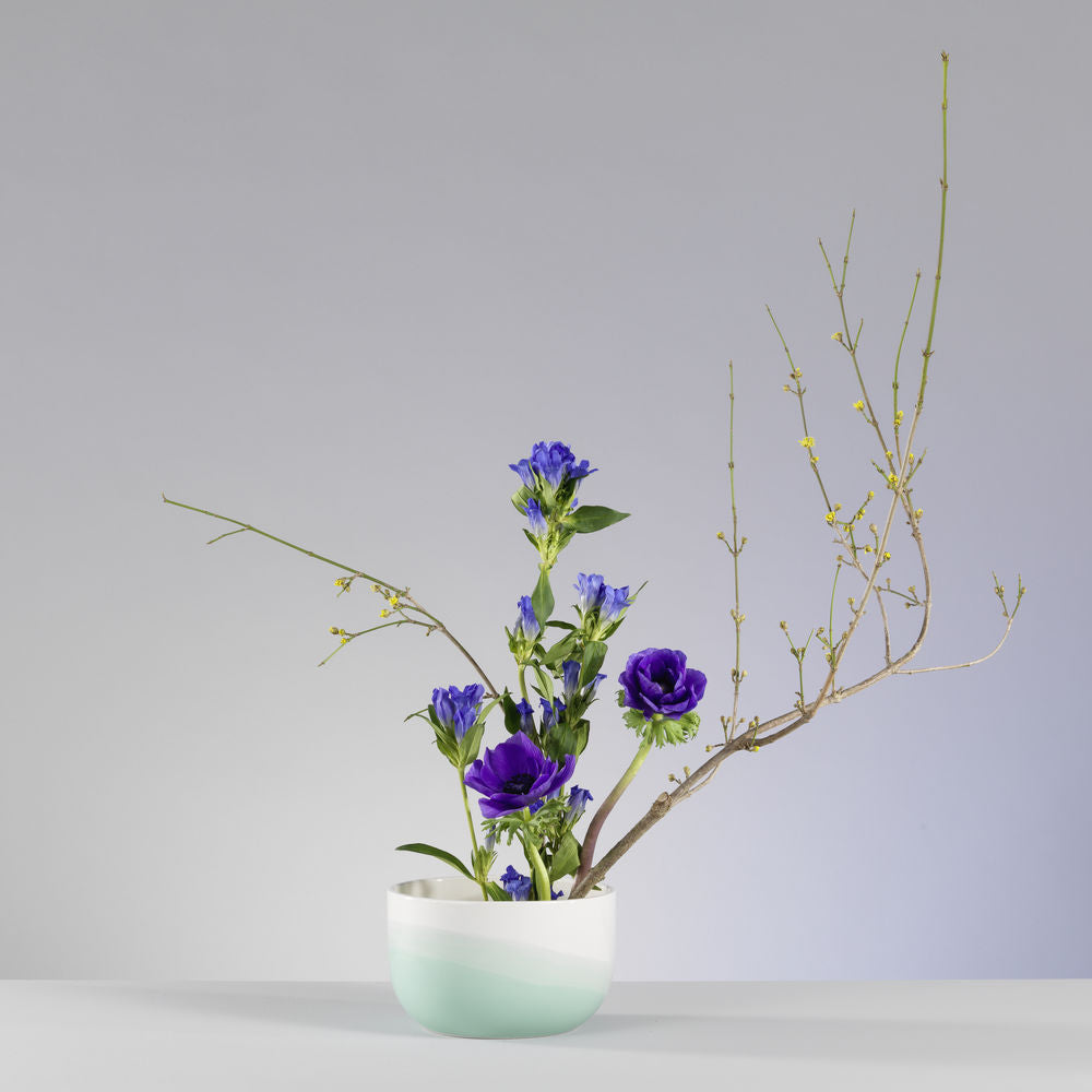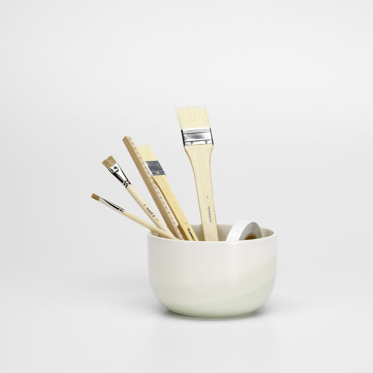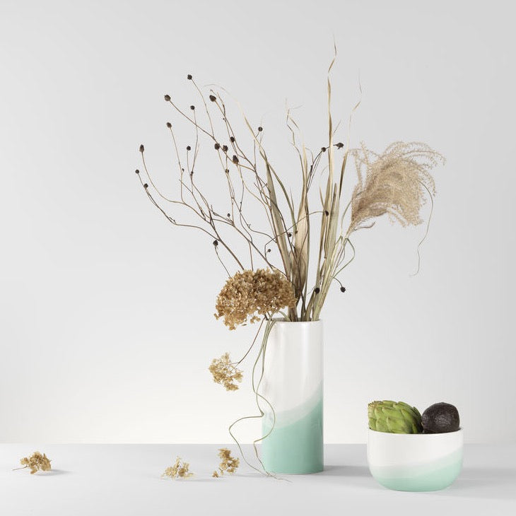 The Herringbone Vessels are created by repeatedly immersing ceramic bowls and vases in a coloured glaze. This process yields a pattern with an intrinsic logic, determined by the dipping angle as well as the shape and weight of the piece. As the dyeing process is performed entirely by hand, each bowl and vase in the Herringbone Collection is a unique object.