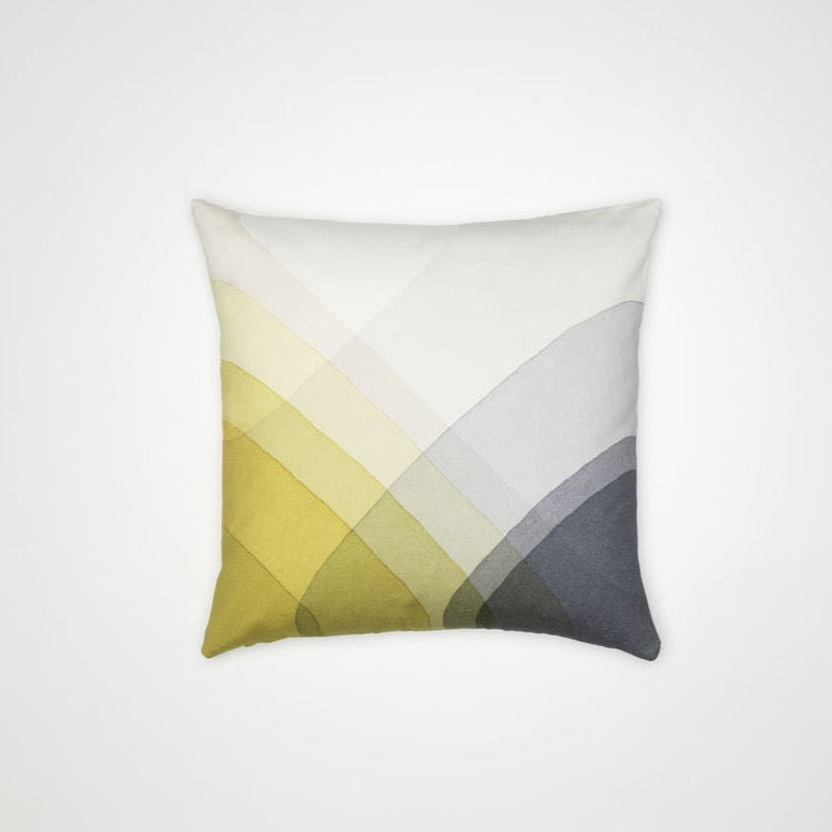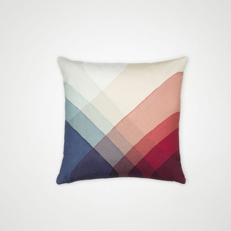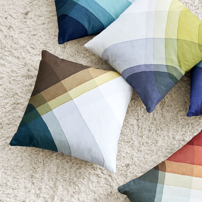 The Herringbone Pillows exude a cheerful freshness thanks to a use of clear colours and captivating patterns, which have a distinctly geometric look despit their handcrafted origins. The intersecting and overlapping bands of varying colour intensity were achieved through multiple immersions in different coloured dyes, with the final result serving as an exact template for the printed pattern of the Herringbone Pillows.
