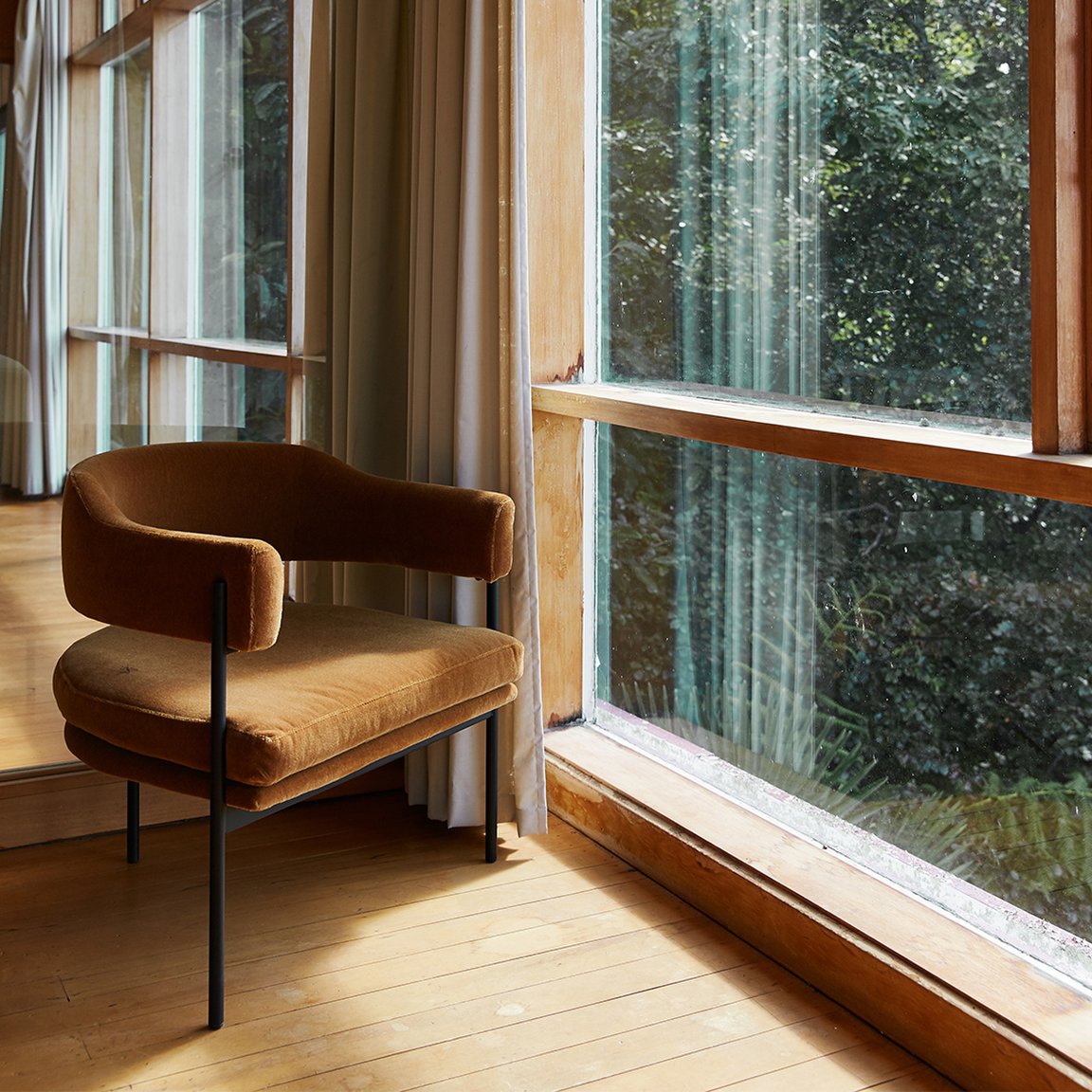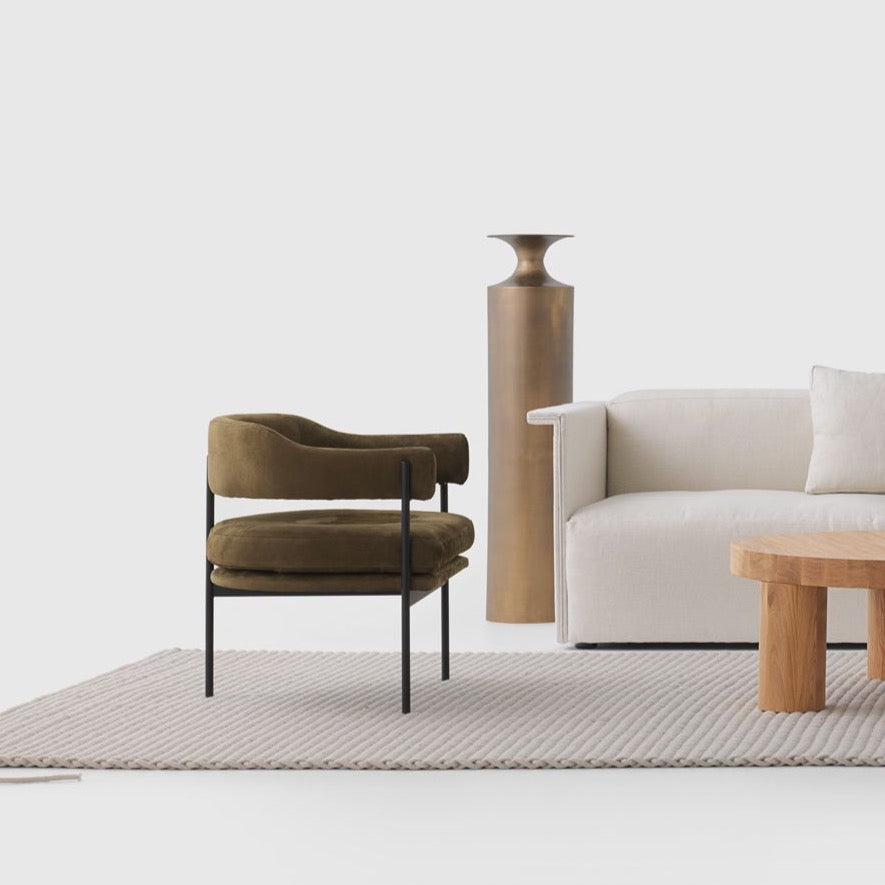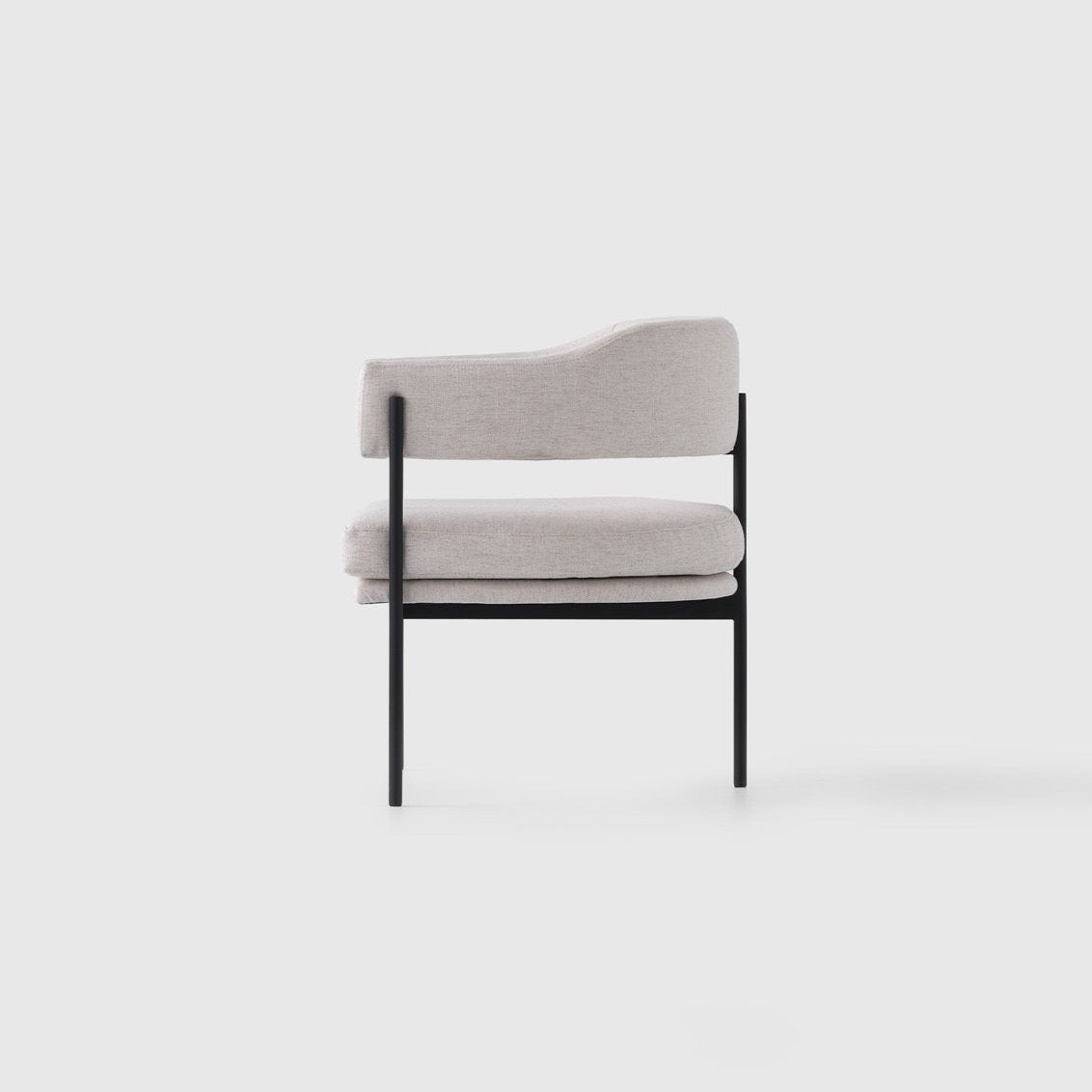 The Isabella Chair is an exercise in the play-off of proportions. Its ultra-slim three-legged steel base provides robust support and acts as a deliberate variant against the gracefully rounded tailored back and plump softness of the seating cushion.