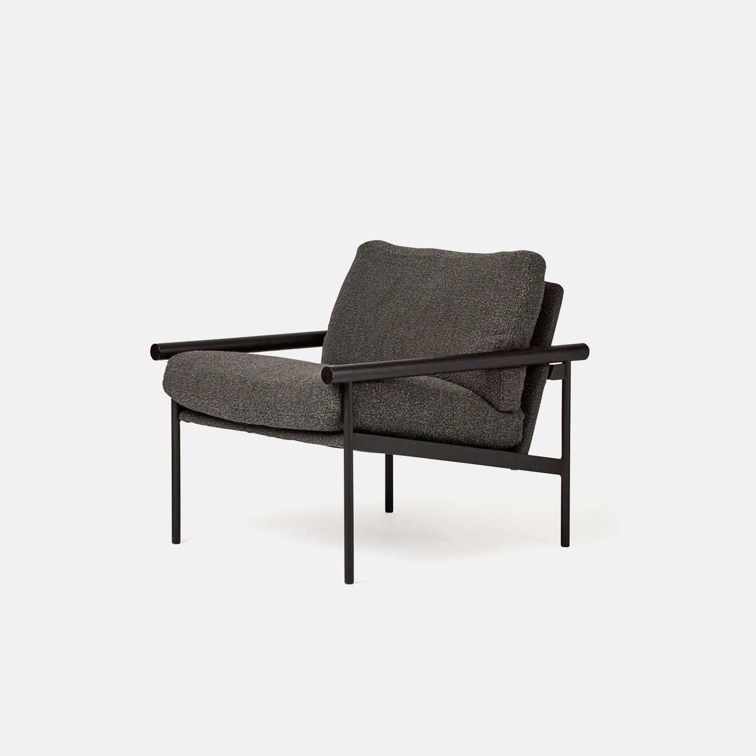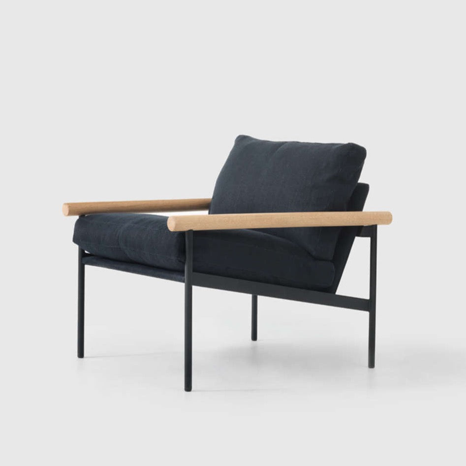 The Parallel Lounge Chair celebrates its robust steel frame rather than concealing it in the upholstery. The black steel frame is offset with the warmth and character of solid natural oak arms. The upholstered seat and back inner is made from a combination of feather and foam to give a superior soft comfort. Designed to work well in numbers or as a stand-alone chair. Available in a firmer density foam for the office and breakout area.