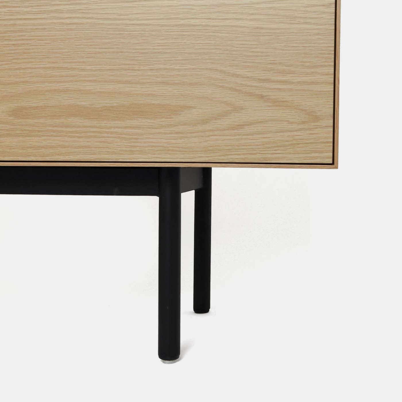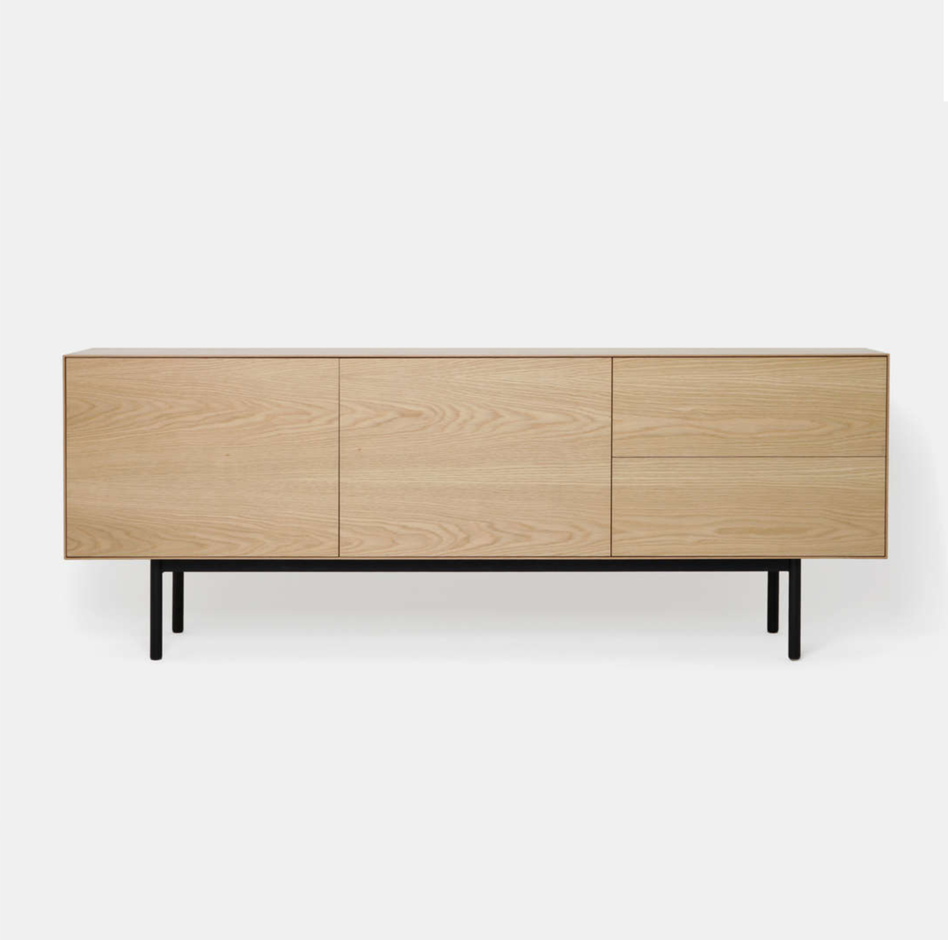 Ideal for the living room, hallway or boardroom the Seam sideboard is constructed from oak veneer and is available in a range of finishes. The base is powder-coated steel. This unit can come in several drawer and cupboard combinations with the flexibility of adjustable shelves, and power access from the back giving the unit the option to house a sound system.
